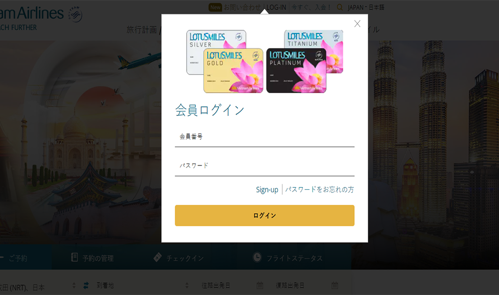 ウェブサイトvietnamairlines.com,にアクセスして、右上の「ログイン」を選択し、会員カード番号とパスワードを入力して、「ログイン」をクリックします。