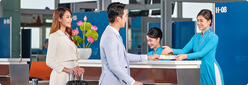 • Hành khách tra cứu thông tin quầy làm thủ tục trên các bảng điện tử tại sân bay; sau đó, đến quầy làm thủ tục của Vietnam Airlines và xuất trình vé máy bay cùng giấy tờ tùy thân. Nhân viên làm thủ tục sẽ kiểm tra thông tin trên vé, in thẻ lên máy bay (boarding pass), làm thủ tục ký gửi hành lý (nếu có) và hướng dẫn các thông tin cần lưu ý như số cửa ra tàu bay, thời gian có mặt tại cửa, v.v.