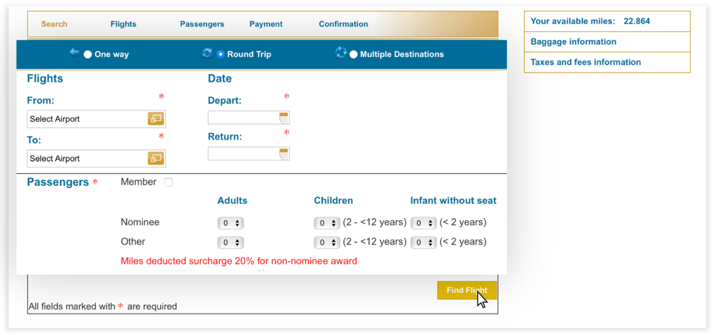會員選擇出發地點,目的地,出發日期,回程日期和乘客人數,然後"搜尋航班"。