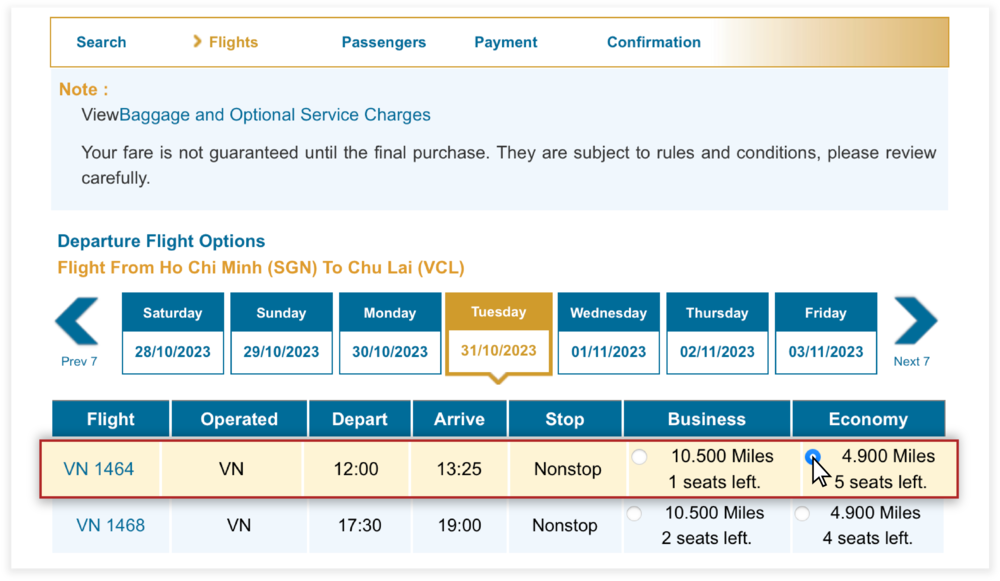 會員可以在此處計算要扣除的賺取里程,或在賺取里程獲取獎勵機票使用里程查詢工具。 在這裡,會員選擇“承運商”,選擇出發日期、出發地點和目的地,然後選擇“計算里程”。系統將顯示旅程資訊和相應里程。