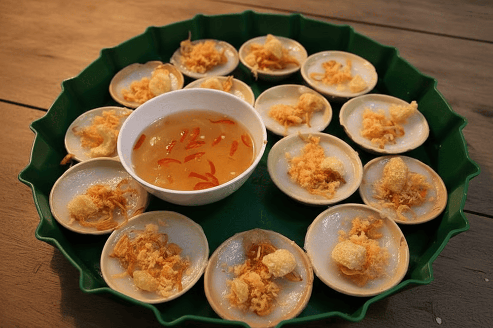 這是一道結合了酥脆與軟糯兩種口感的精緻點心。底層的米餅炸得酥脆,上層的糯米糰則軟糯,內餡是鹹香的蝦肉。食用時淋上酸甜魚露醬,便是一道風味十足的順化美食。