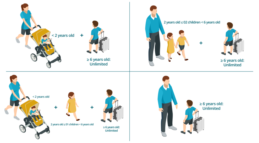 Carry-on baggage for children under two years old includes 1 piece and should not exceed 3kg (including food, milk, and nappy) and one compact stroller/cradle that fits inside an aircraft baggage compartment. If carry-on baggage compartments are out of place, strollers/cradles are transported as checked baggage (free of charge).