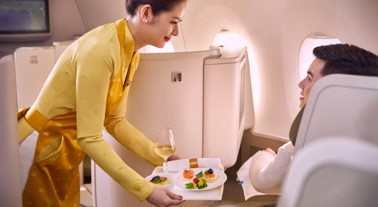 Premium wine and champagne: Exclusively for Business class passengers on flights to/from Europe, Australia, the US, Japan, and South Korea, the premium wine and champagne originated from famous vineyard regions, selected by beverage experts are served.