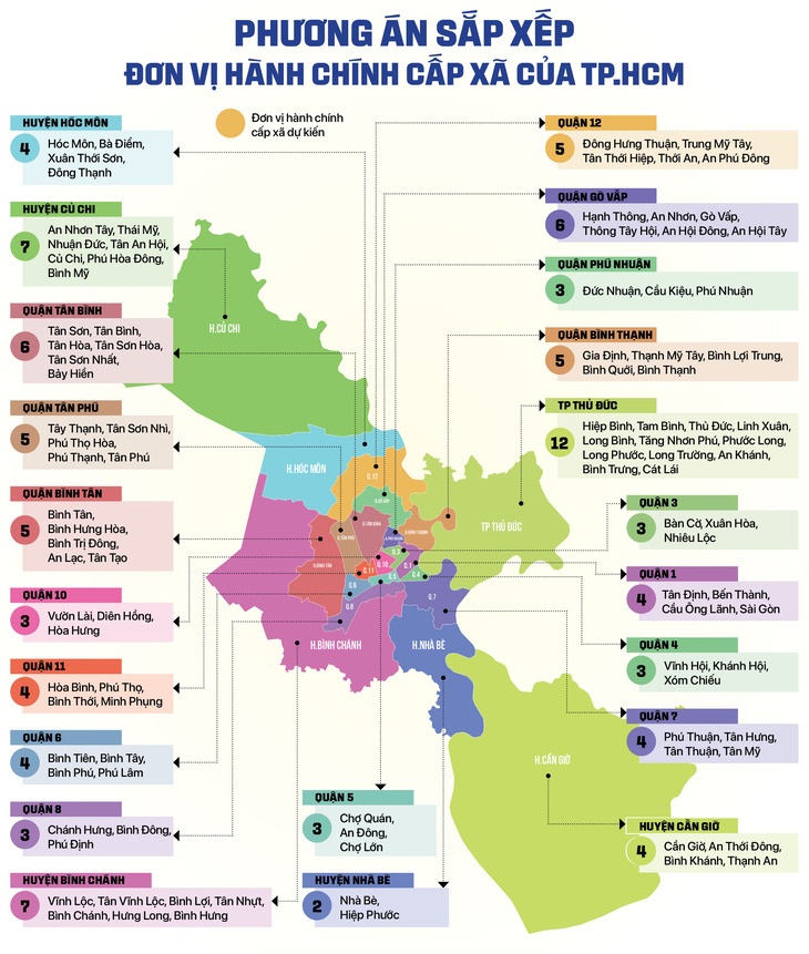 Nghị quyết số 25/NQ-HĐND về việc sắp xếp lại đơn vị hành chính cấp xã trên địa bàn Thành phố, bản đồ các quận TPHCM sẽ có sự thay đổi về các đơn vị phường, xã. Cụ thể từ ngày 01/07/2025, 273 đơn vị hành chính của TPHCM sẽ được sáp nhập trở thành chỉ còn 102 đơn vị phường, xã.