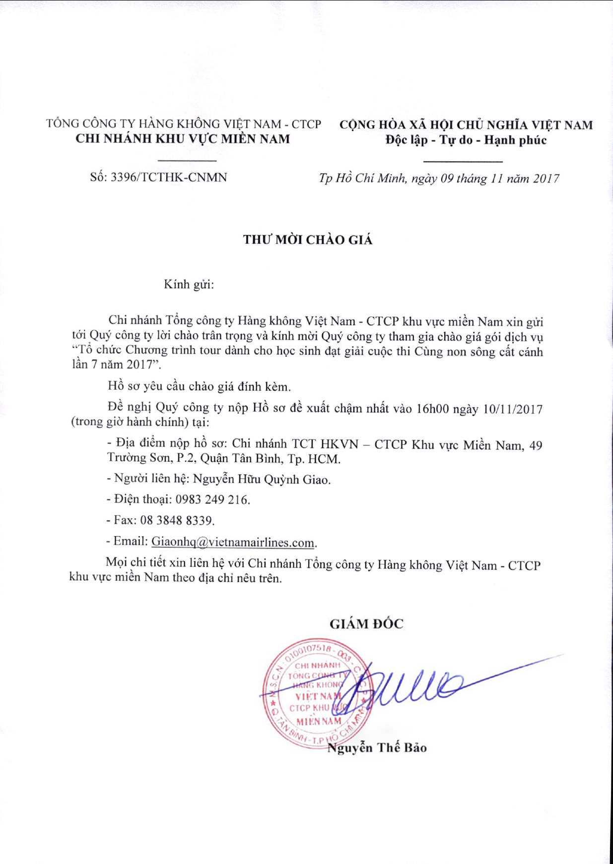Kính mời các đối tác, nhà cung cấp tham gia chào giá. Thông tin gói hàng hóa cũng như chi tiết liên hệ với Chi nhánh Tổng công ty Hàng Không Việt Nam - CTCP khu vực miền Nam được đính kèm tại đây.