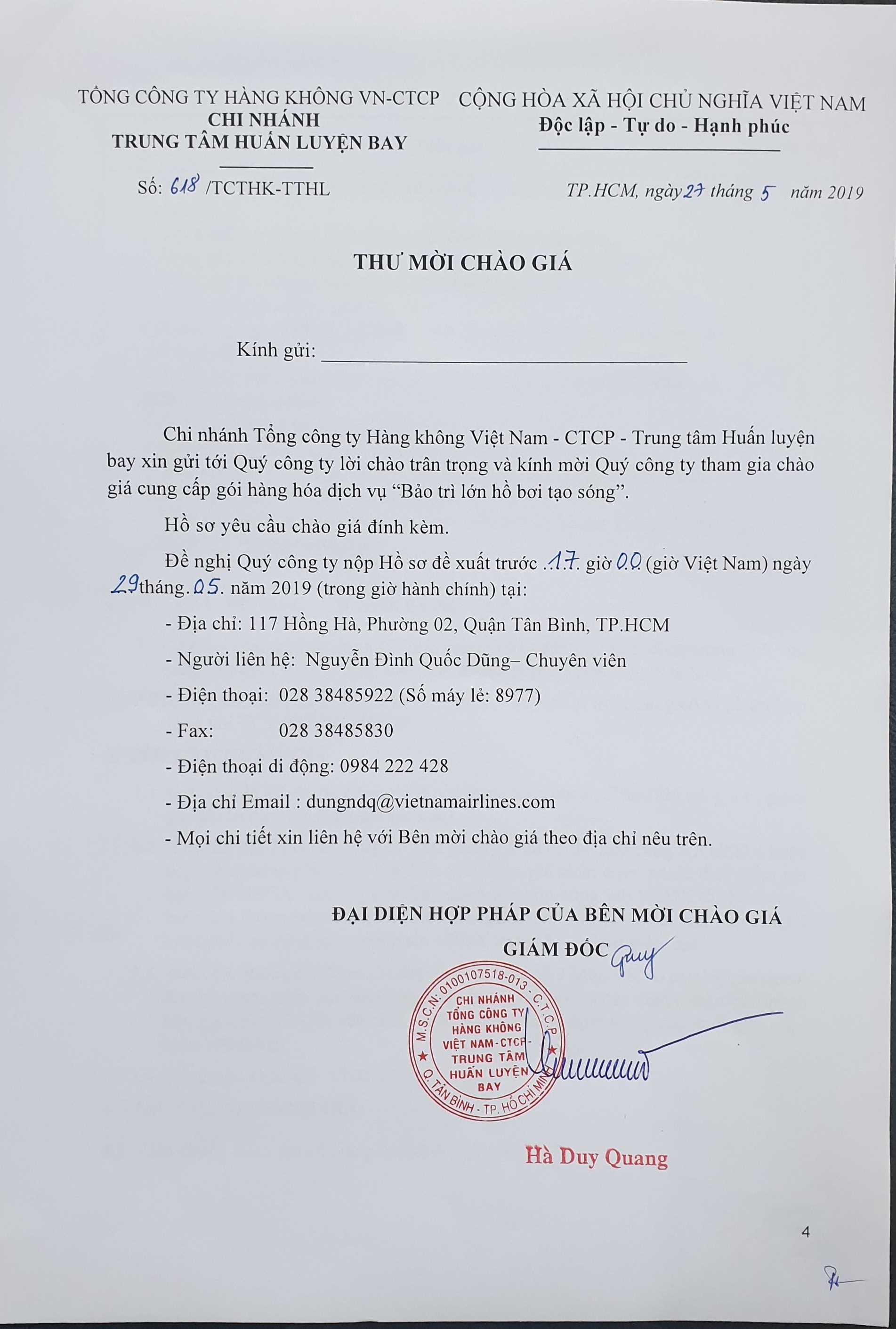 Trung tâm HLB cần triển khai gói hàng hóa dịch vụ “Bảo trì lớn hồ bơi tạo sóng” tới các đối tác. Kính mời các đối tác cung cấp tham gia chào giá. Thông tin gói dịch vụ cũng như chi tiết liên hệ với TTHL được đính kèm tại đây.