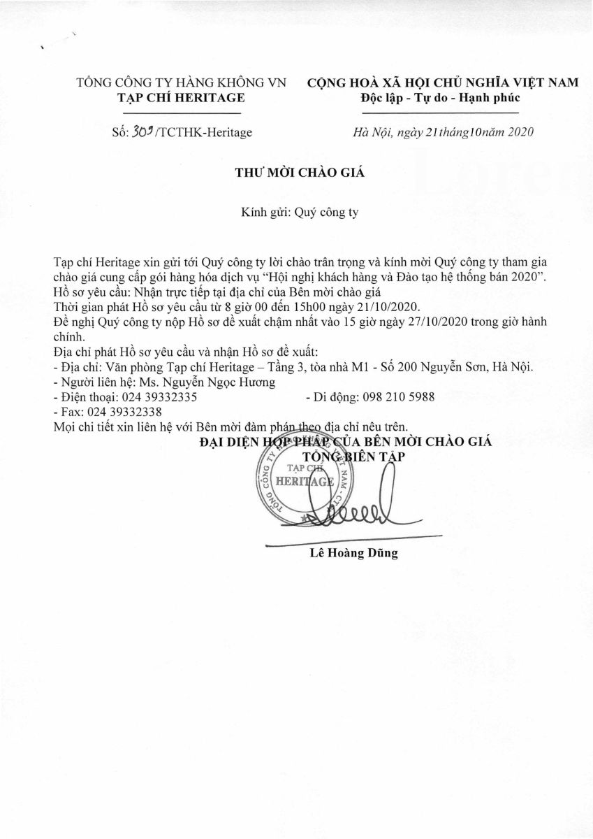 Tổng công ty Hàng không Việt Nam - CTCP - Tạp chí Heritage triển khai mua sắm gói dịch vụ tổ chức "Hội nghị khách hàng và Đào tạo hệ thống bán 2020".