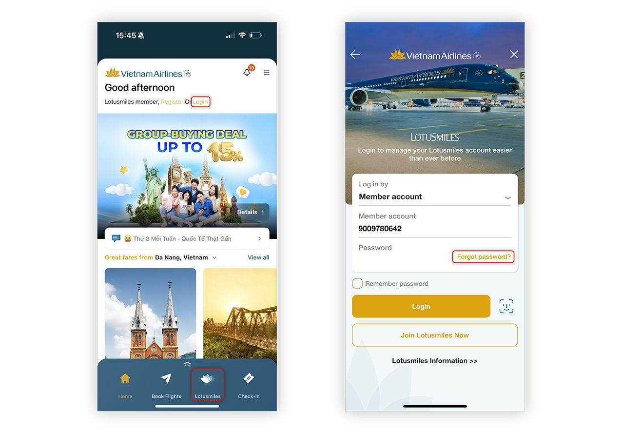Step 1: Open Vietnam Airlines app, select "Login" and "Forgot password"; or select "Lotusmiles" from the bottom toolbar and click on "Forgot password."