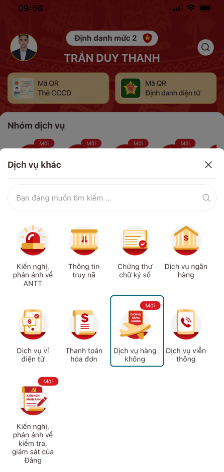 Bước 1: Hành khách đăng nhập ứng dụng VNeID với tài khoản đã được định danh mức 2.