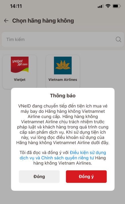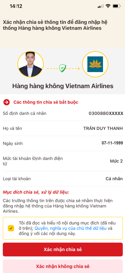 Bước 7: Sau khi xác nhận đồng ý quy định, mục đích chia sẻ, xử lý dữ liệu và hành khách được chuyển hướng sang ứng dụng Vietnam Airlines để mua vé. Vui lòng tham khảo Hướng dẫn mua vé trên ứng dụng Vietnam Airlines.