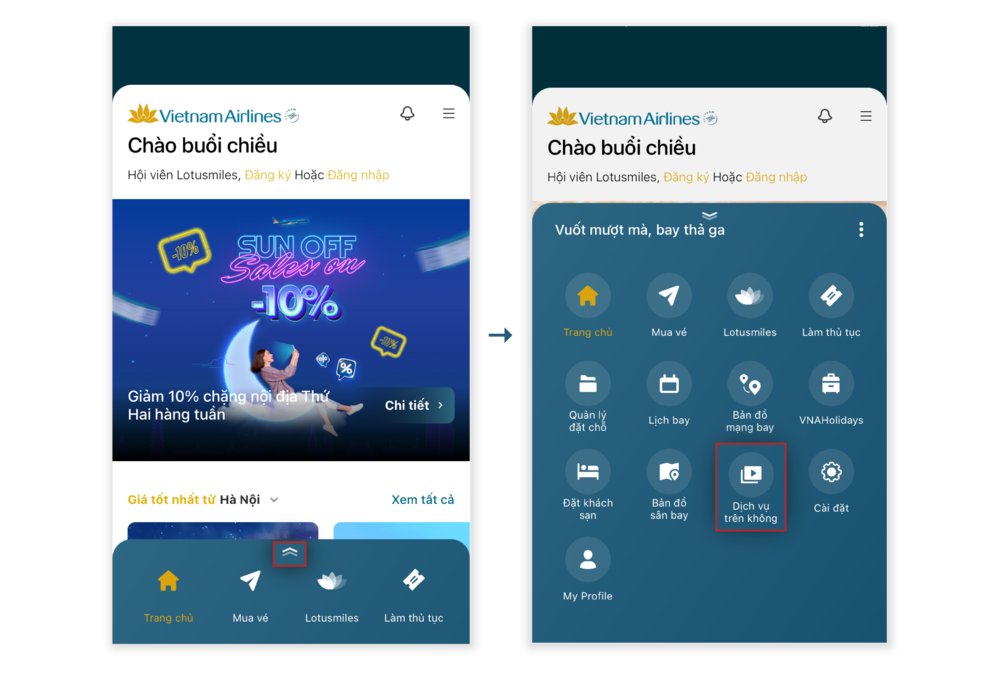 Bước 1: Hành khách truy cập app Vietnam Airlines. Tại trang chủ, hành khách vuốt mở thanh công cụ ở phía dưới và chọn mục “Dịch vụ trên không”.