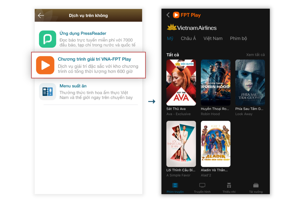 Bước 2: Tại cửa sổ “Dịch vụ trên không”, chọn “Chương trình giải trí VNA-FPT Play”. Màn hình chuyển hướng sang giao diện app FPT Play hoặc chuyển hướng đến kho ứng dụng để tải app.
